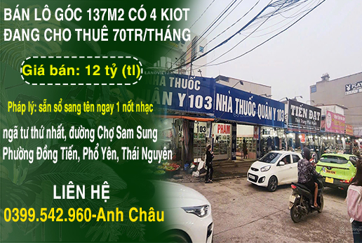 CHÍNH CHỦ BÁN LÔ GÓC 137M2 CÓ 4 KIOT ĐANG CHO THUÊ 70TR/THÁNG DUY NHẤT CHỢ SAM SUNG-PHỔ YÊN